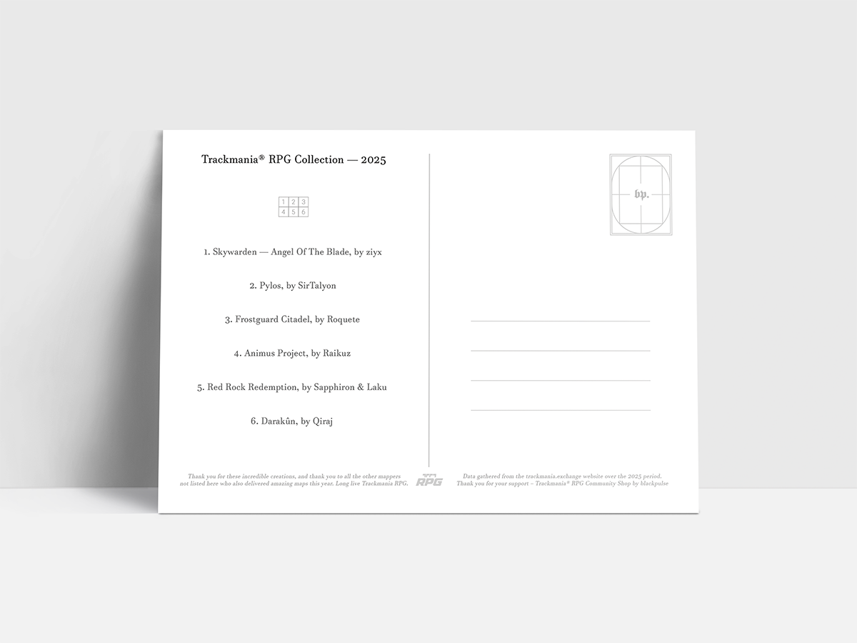 Celebrate the legacy of Trackmania RPG with these high-quality collector postcards, featuring the most iconic maps released every year since the game has been out!